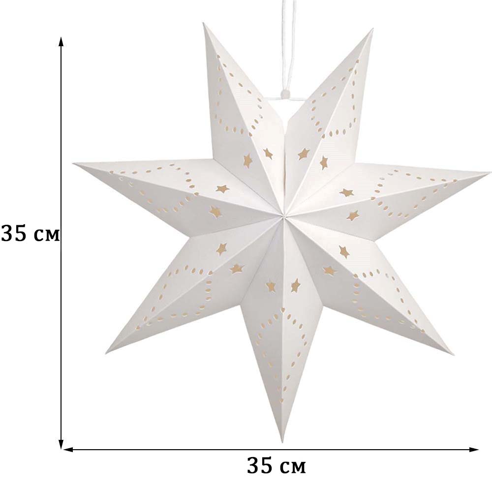 Семиконечная объемная звезда 35 см — великолепный декор из тонкого перфорированного картона. Создает красивые световые эффекты. Поставляется в сложенном виде, в комплекте шнур для фиксации объема и подвеса.